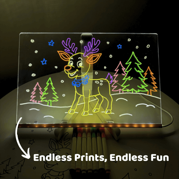 You can instantly download and print 20 Christmas themed designs your kids will love. Simply slide a page under the Glow Board and they can trace festive pictures again and again. It turns your Glow Board into a powerful learning tool that feels like play.