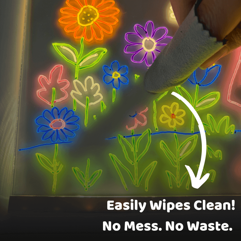 Each Glow Board comes with 7 vibrant, non-toxic markers and a cleaning cloth. Simply wipe with the cloth and it’s ready for the next round of creativity.