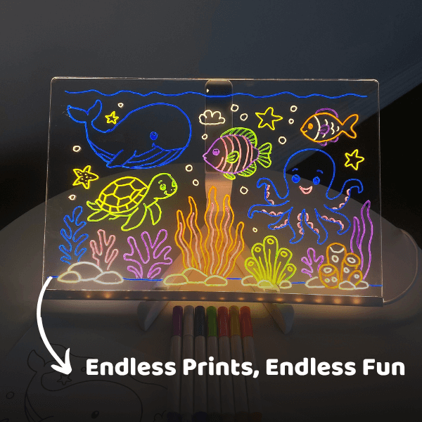 Simply print out the designs you want, place the page underneath the Glow Board’s clear surface and let your child trace over it with their glow markers. This helps them practice drawing step by step, building confidence as they go and makes even tricky pictures easy to recreate.